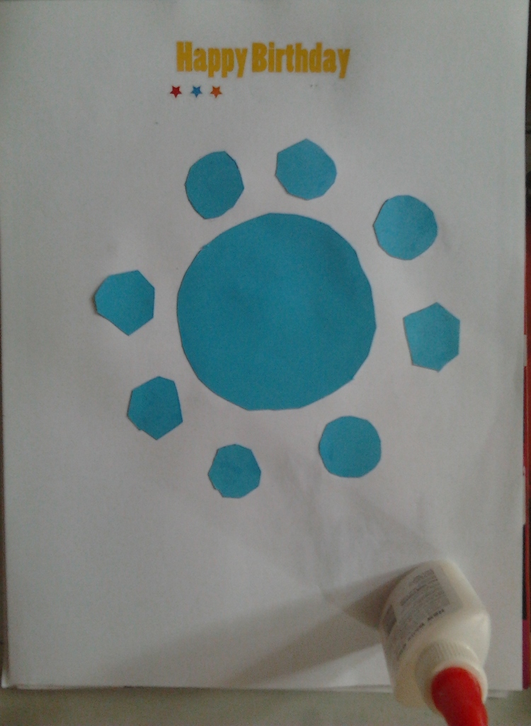 The next step was to glue the circles. He first glued the big circle in the middle of a bond paper which served as our cake. This was surrounded by smaller circles which became our cupcakes.